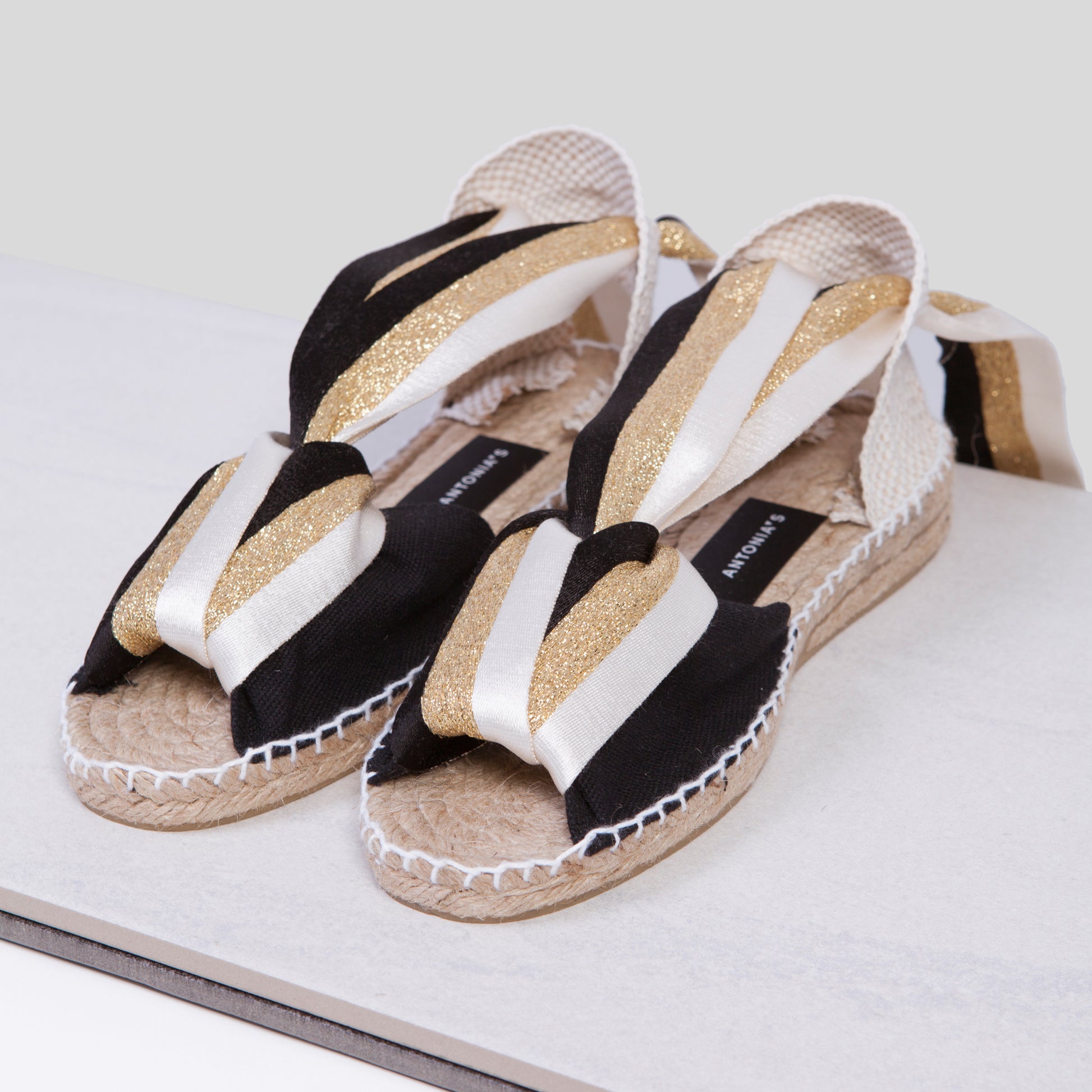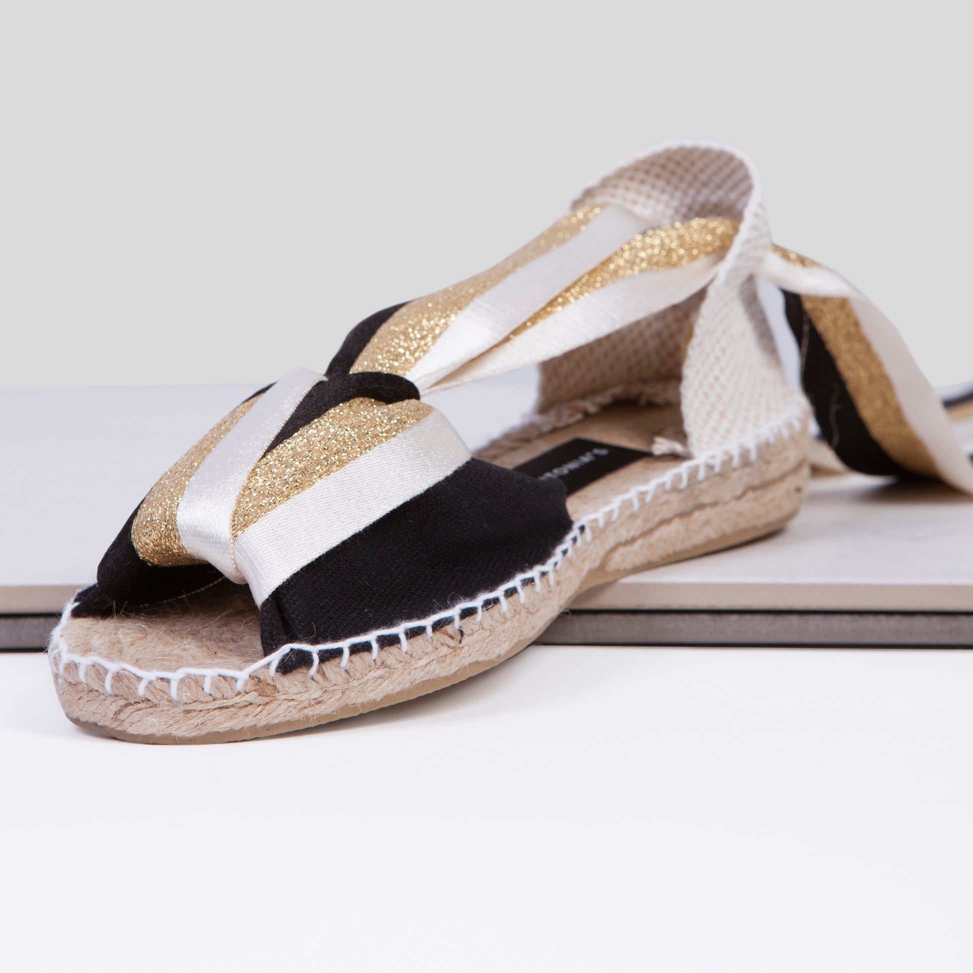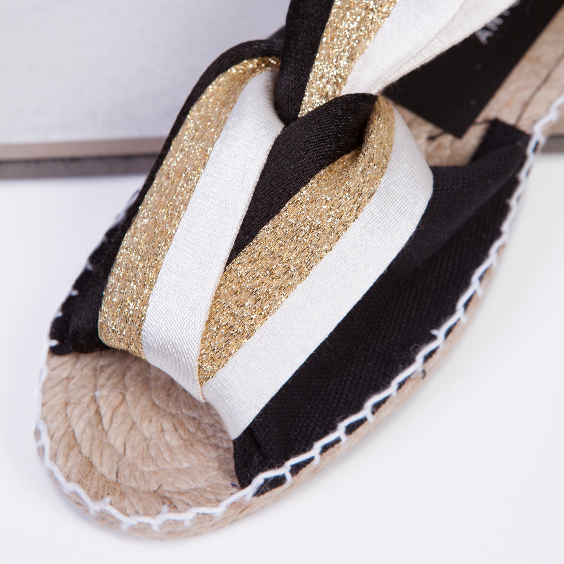 Canvas and yute espadrille with striped ribbon. This style has a 3cm wedge.