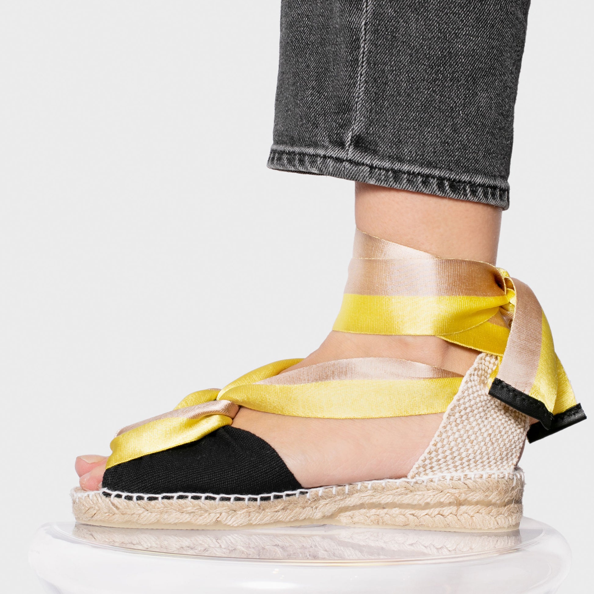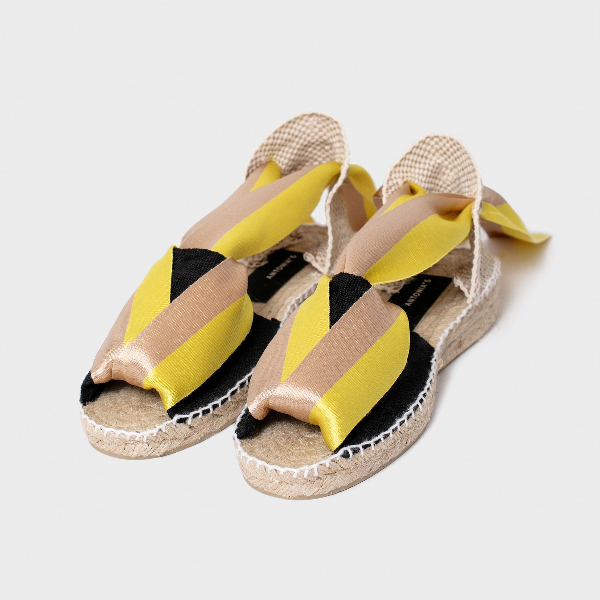 Canvas and yute espadrille with striped ribbon. This style has a 3cm wedge.
