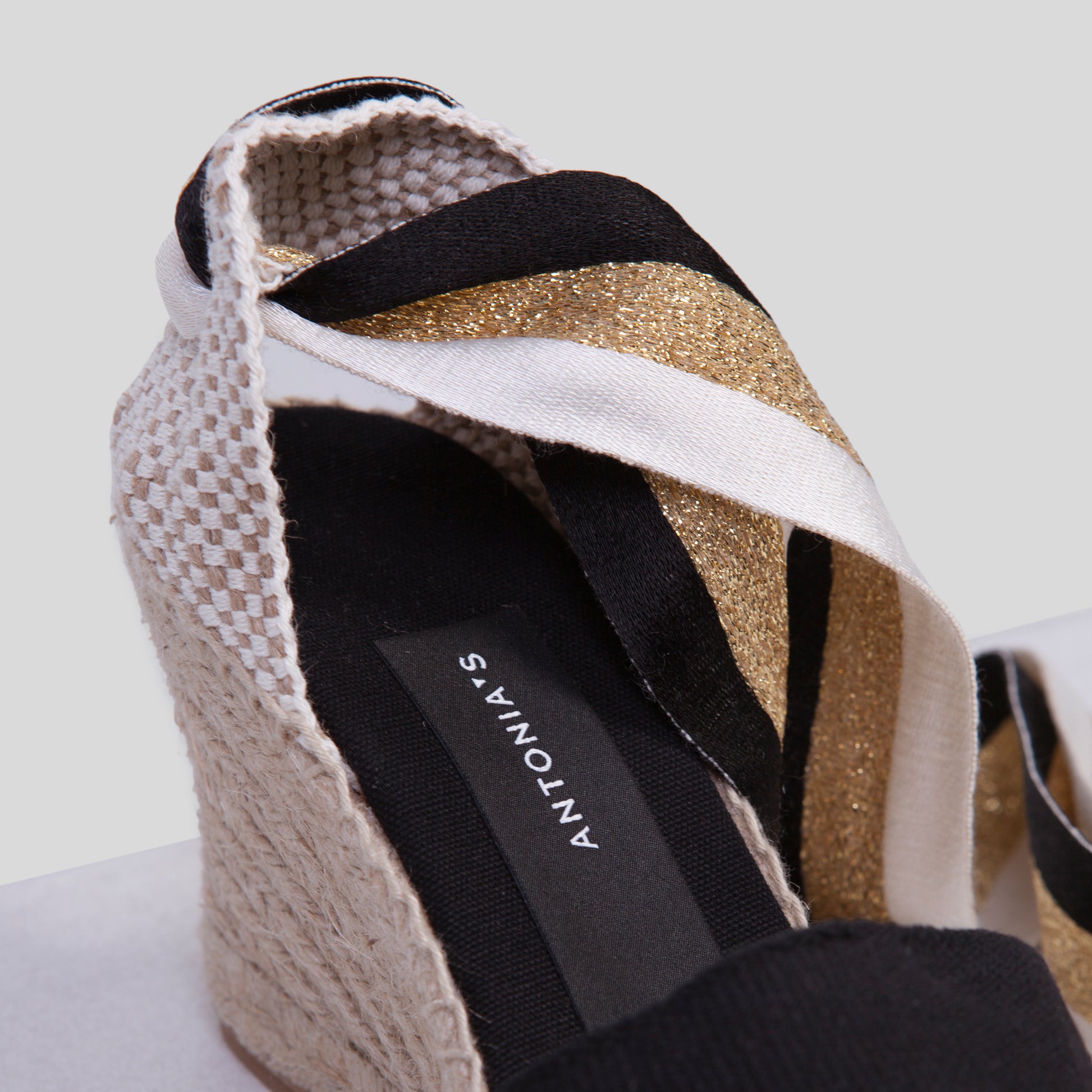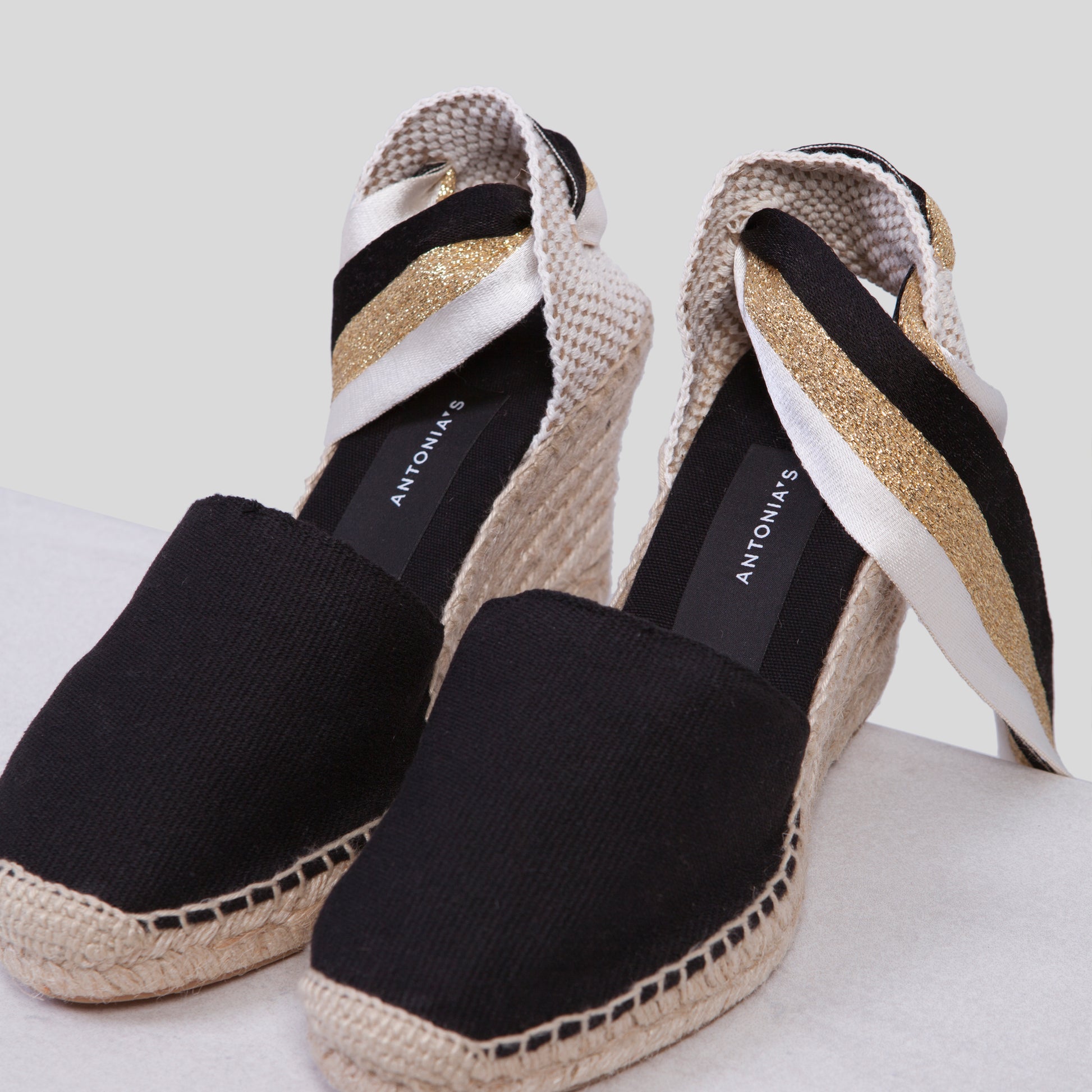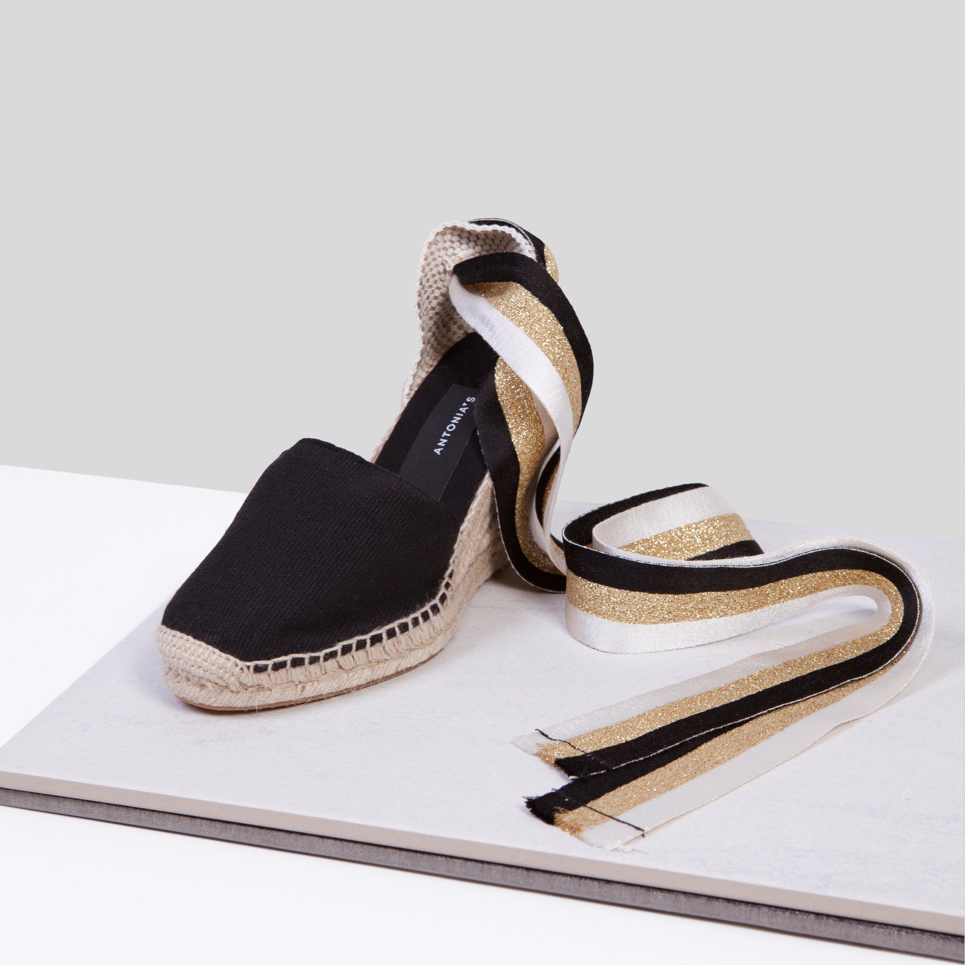 Canvas and yute espadrille with striped ribbon. This style runs true to size. Heel 8cm.